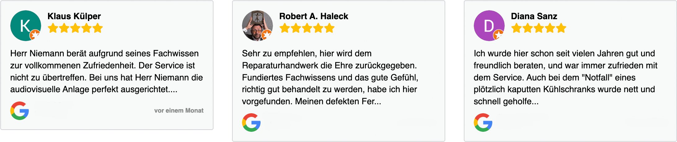 Unsere Kunden schätzen schnelle Termine, faire Beratung und dass wir hochwertige Geräte wie Loewe nicht gleich abschreiben. Dieses Vertrauen ist unser Antrieb – oft sind wir in 3 Stunden da.“